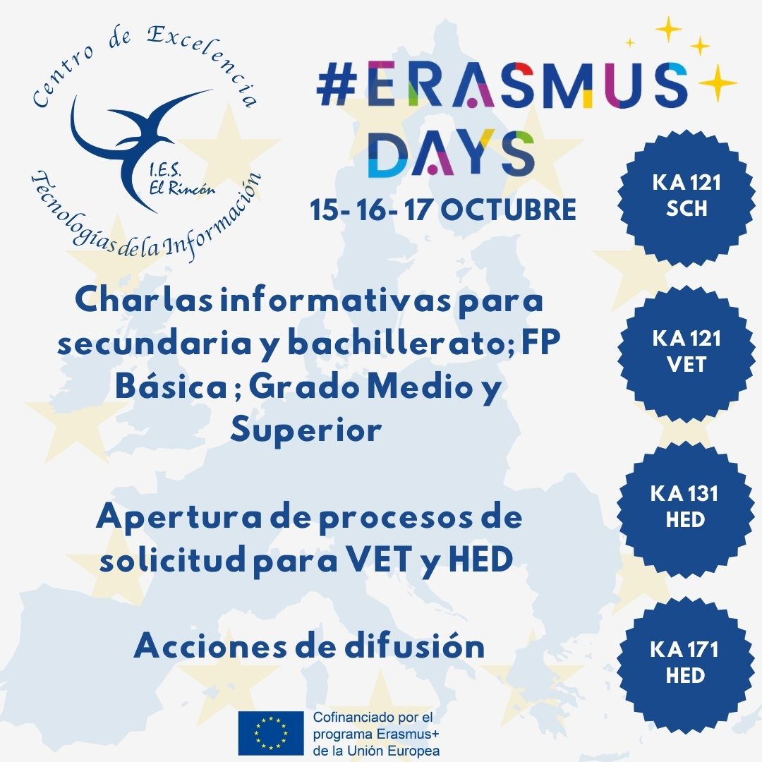 Esta semana celebraremos los Erasmus Days en el IES El Rinc贸n. En estas jornadas podremos compartir con la comunidad educativa los proyectos Erasmus+ en los que participamos y sus beneficios.