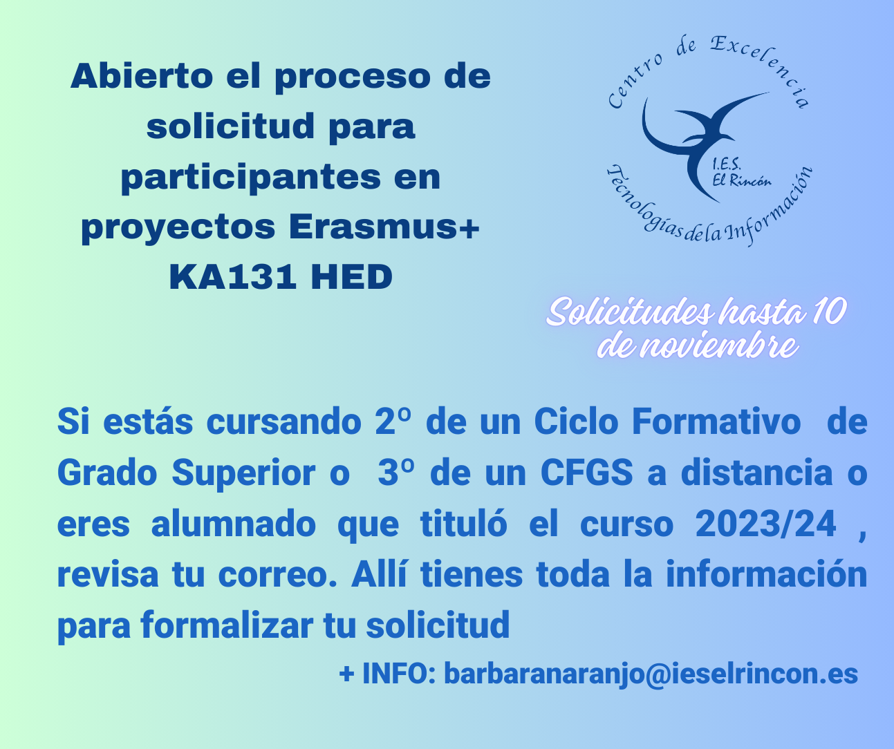 A partir del 31 de octubre y hasta el 10 de noviembre de 2024 (ambos incluidos) queda abierto el plazo para solicitar la Beca Erasmus+ KA131 HED en los Grados Superiores y Cursos de Especialización (incluyendo alumnado titulado/egresado).