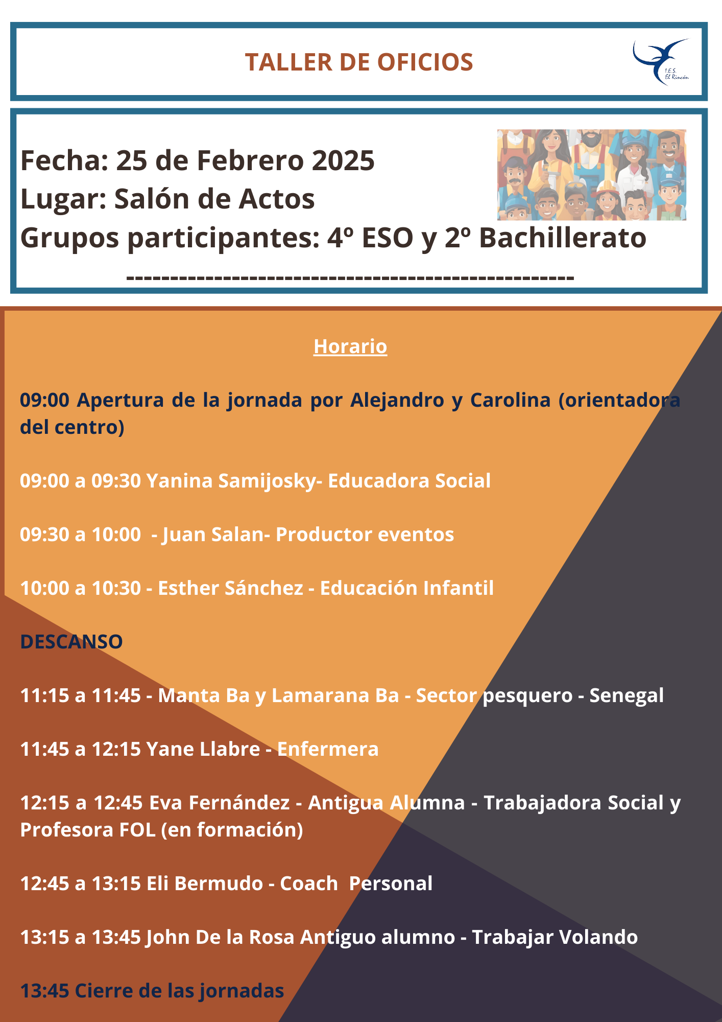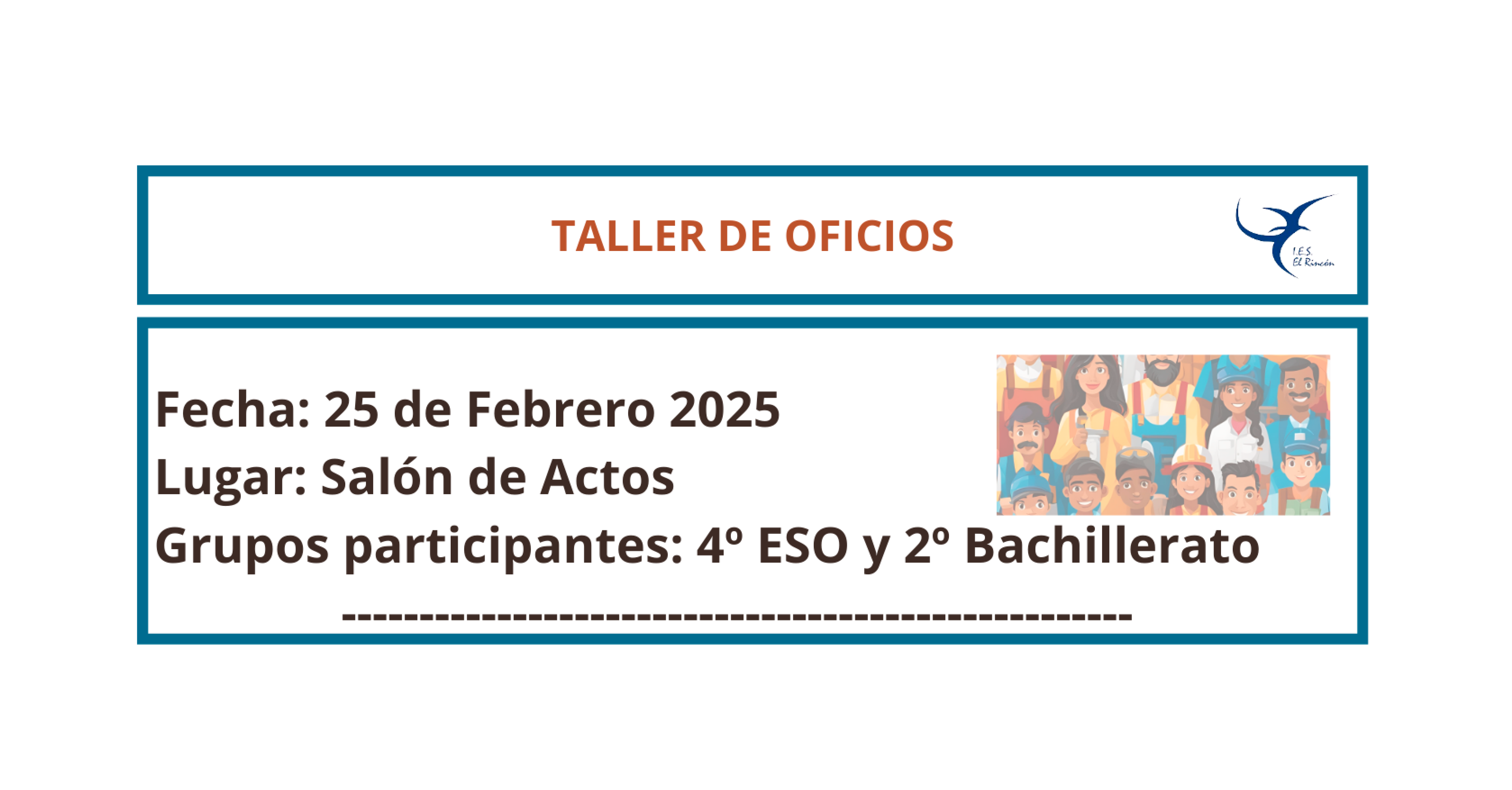 Este 25 de febrero tendremos, por primera vez, un taller de oficios en el que padres, madres y antiguos/as alumnos/as del centro participarán de manera activa. Dicha participación constará de una presentación en la que se hablará de futuro profesional desde un prisma eminentemente humano y práctico.