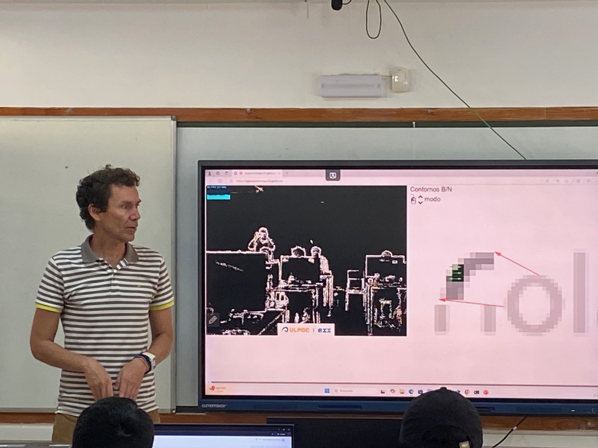 Finalizó su exposición mostrándonos en tiempo real en el aula (utilizando para ello una cámara web) la aplicación de diferentes filtros, así como la detección y análisis de objetos en personas; en este caso del alumnado y el profesorado.