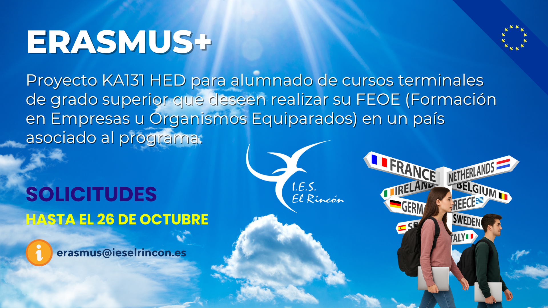A partir del 17 de octubre de 2025 y hasta el día 26 del mismo mes (ambos incluidos) queda abierto el plazo para solicitar la Beca Erasmus+ KA131 HED en los Grados Superiores y Cursos de Especialización (incluyendo alumnado titulado/egresado).
