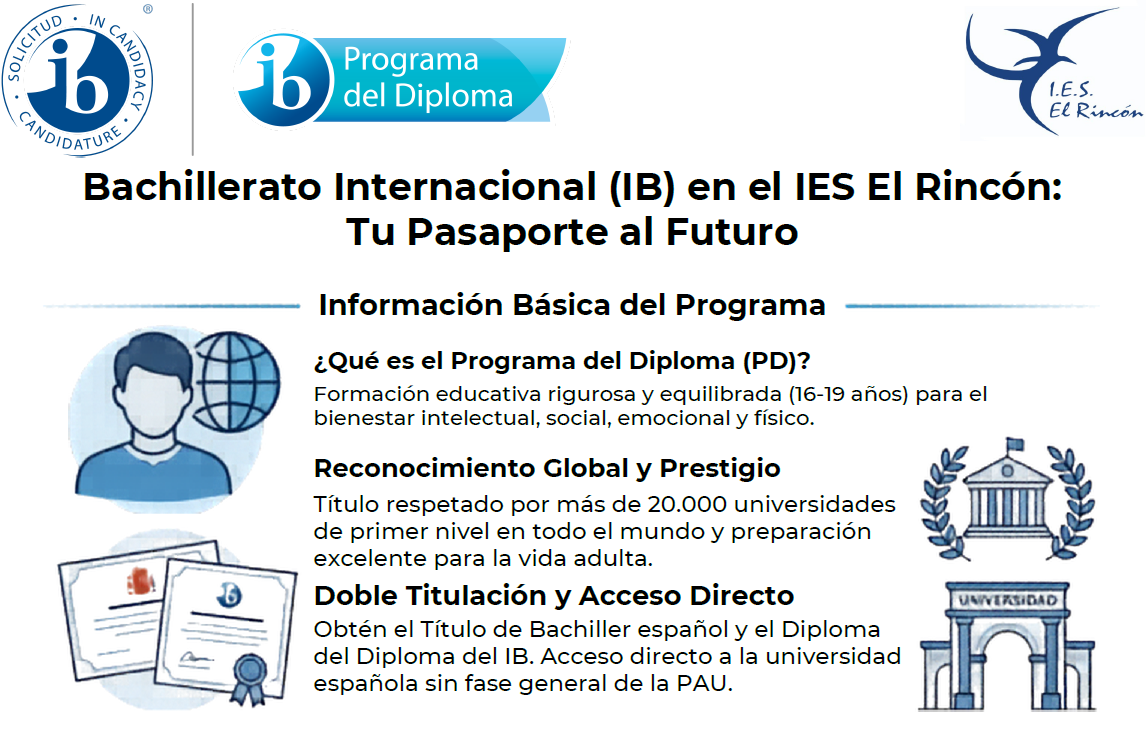 Nos complace informarles de una oportunidad educativa excepcional. El IES El Rincón ha sido seleccionado por la Consejería para impartir el Programa de Diploma del Bachillerato Internacional (BI) a partir del próximo curso 2026/2027, siendo el único centro público de la provincia en ofrecerlo.